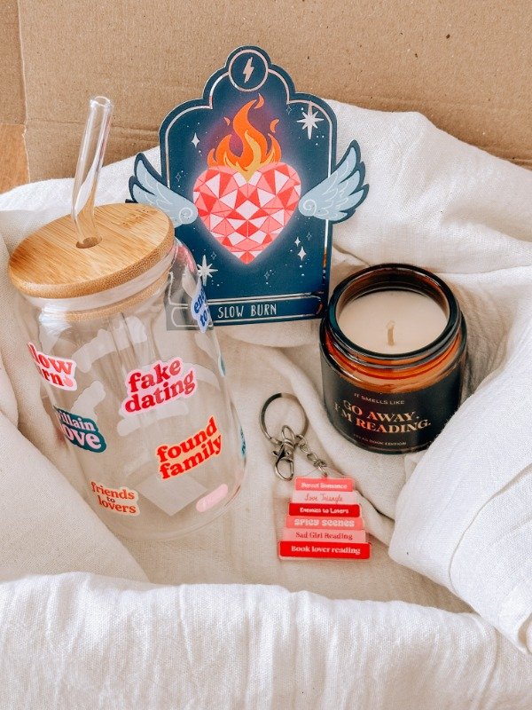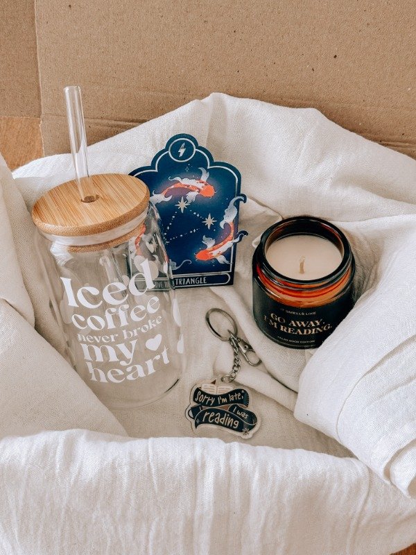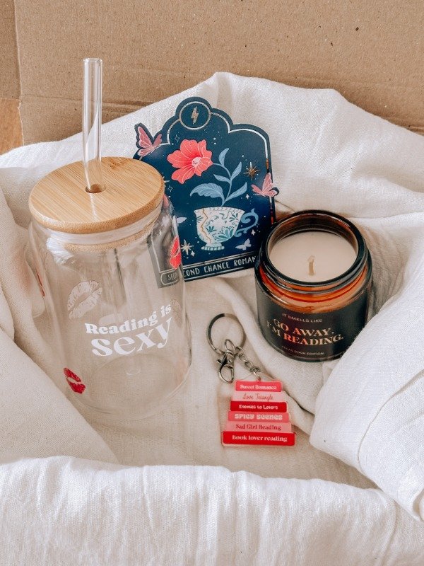 La caja incluye: Taza/Vaso, Marcapágina, Llavero y Velita.